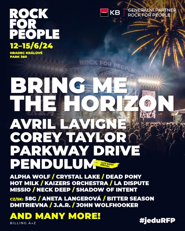 První novembrový den přinesl pořádně nadupaný balíček kapel, které příští léto od 12. do 15. júna 2024 zahrají na 28. ročníku festivalu Rock for People v hradeckém Parku 360. Fanoušci se mohou těšit na nespoutanou rockerku Avril Lavigne, frontmana kapely Slipknot Coreyho Taylora v sólovém projektu, úderné metalisty Parkway Drive nebo návrat legendárních Pendulum. Mezi dalšími nově oznámenými jmény se objevili například Missio, Neck Deep, La Dispute a z československé scény J.A.R. nebo Aneta Langerová. “Zveřejnili jsme teprve ochutnávku dalšího ročníku, který bude pokračovat v trendu nasazeném předchozími dvěma úspěšnými ročníky,” komentuje oznam ředitel festivalu Michal Thomes, a dodává: “Ještě nás čeká oznámení dalších tří headlinerů, kteří doplní již oznámené Bring Me The Horizon. A samozřejmě v prosinci nebude chybět ani oblíbený adventní kalendář s celkem čtyřiadvaceti novými kapelami do lineupu.”