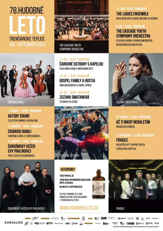 Toto leto Kursalon v Trenčianskych Tepliciach opäť ožije prítomnosťou známych osobností! Festival Hudobné leto oslavuje svoj 78. ročník a prinesie 10 výnimočných podujatí. Tešiť sa môžete na vystúpenia Zuzany Smatanovej, skupiny Fragile, Cigánskych Diablov, Čarovných ostrohov a mnohých ďalších.