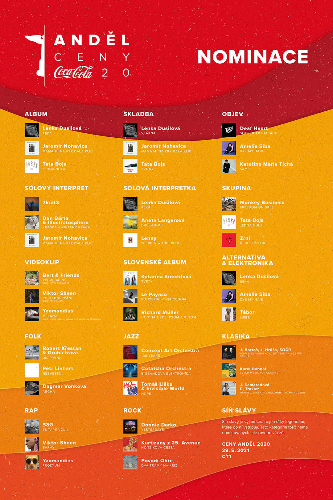 Jubilejné Ceny Anděl Coca-Cola 2020 oznamujú nominácie. Najviac ich získala Lenka Dusilová