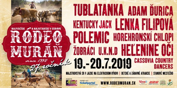 Najlepšie a najstaršie ródeo v Európe! To je Ródeo Muráň, ktoré sa tento rok bude konať už po 27-my raz. Príďte si vychutnať krásu tátošov a umenie ich jazdcov do Muráňa 19. až 20. júla. V obci v revúckom okrese sa stretávajú milovníci divokého západu a jazdenia na koňoch, ktorí majú navyše v sebe súťažné gény. Okrem ródeo súťaží sa môžete tešiť na koncerty kapiel Tublatanka, Polemic, Heľenine oči, Adam Ďurica, U.K.N.D., Lenka Filipová a Žobráci.