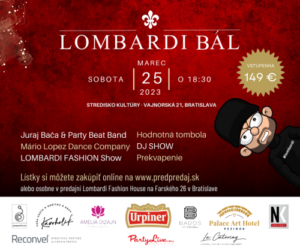 Známy slovenský dizajnér Jozef Grondžák sa rozhodol usporiadať ples! Nahoďte sa do gala a prijmite pozvanie na 1. ročník veľkolepého LOMBARDI BÁLu! 25. marca 2023 o 18:30 vás v Stredisku kultúry na Vajnorskej 21 v Bratislave čaká jedinečný galavečer plný prekvapení. Bál bude moderovať charizmatický Juraj Bača, ktorý spolu so svojou kapelou urobí fantastickú náladu a roztancuje celý parket. Všetkých tancom ohúri energický Mário Lopez a jeho sexi tanečnice z Dance Company. Nebude chýbať bohatá tombola a módna prehliadka usporiadateľa plesu LOMBARDI FASHION HOUSE!
