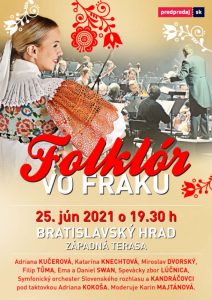 Nenechajte si ujsť jedinečný program Folklór vo fraku 25. júna 2021 na Západnej terase Bratislavského hradu. Galavečer bude moderovať Karin Majtánová. Motívom podujatia je oslava slovenskej ľudovej piesne. Vstupenky si môžete kúpiť na Prepredaj.sk