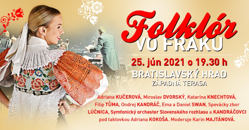 Bratislavský hrad zažije veľkolepú hudobnú akciu! Galakoncert Folklór vo fraku ponúkne 25. júna najkrajšie slovenské ľudové piesne vo fantastických aranžmánoch pre mimoriadne sólové hlasy, veľký Spevácky zbor Lúčnica a Symfonický orchester Slovenského rozhlasu. Na pódiu sa predstaví stovka účinkujúcich vo veku od 10 do 65 rokov! Najpopulárnejšie ľudovky zaspievajú Adriana Kučerová, Katka Knechtová, Miroslav Dvorský, Filip Tůma a Ondrej Kandráč s Kandráčovcami. To všetko pod taktovkou skvelého dirigenta Adriana Kokoša. Stretneme sa 25. júna na Západnej terase Bratislavského hradu!