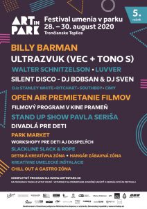 Piaty ročník festivalu ART IN PARK sa bude konať 28.-30.augusta 2020 v Kúpeľnom parku Trenčianske Teplice. Vstup na program v parku je zdarma. Vstupenky na premietania v kine Prameň je možné zakúpiť si počas festivalu priamo v kine. Kompletný program aj viac informácií nájdete na webovej stránke a na facebooku.