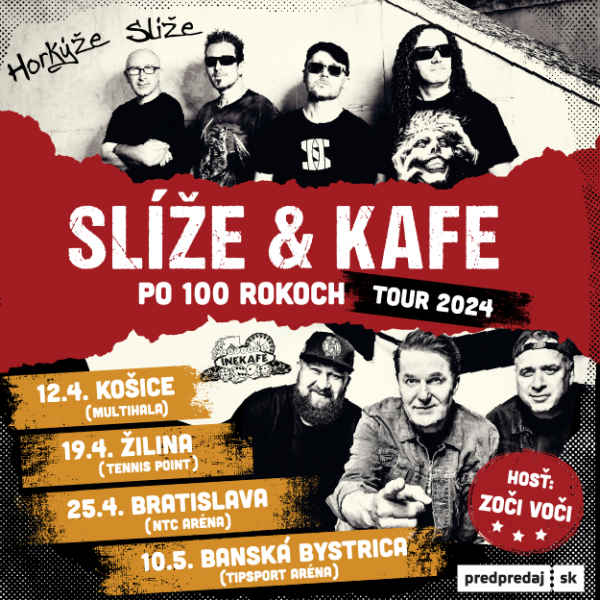 HORKÝŽE SLÍŽE a INEKAFE štartujú o mesiac prvé spoločné turné! Najúspešnejšie slovenské kapely vo svojich žánroch si so sebou privezú dva kamióny techniky a pyrotechnických efektov! Bratislavský koncert SLÍŽE & KAFE Po 100 rokoch Tour 2024 je už vypredaný a v ostatných mestách zostávajú posledné vstupenky! Nenechajte si ujsť dokonalé spojenie a vyše trojhodinovú rockovú show 12.4. v Košiciach, 19.4. v Žiline a 10.5. v Banskej Bystrici!
