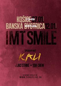 Špeciálnym hosťom bude nielen Laci Strike a SDA CREW, ktorých sme mali možnosť vidieť s IMT SMILE už počas tohto roka, ale spoločne sa so skupinou fanúšikom predstaví KALI. Práve s ním, už niekoľko týždňov, stále bodujú v slovenských rádiách so skladbou Nič sa nemení. „V roku 2018 sme spoločne nahrali skladbu Poď so mnou, ktorá rozhodne nemôže chýbať v našom koncertnom playliste a ktorá má už viac ako 18 miliónov videní na youtube. A tešíme sa, že si spolu s Kalim zahráme už aj našu novú spoločnú pieseň Nič sa nemení. V januári si to v Košiciach a v Banskej Bystrici poriadne užijeme aj s našimi fanúšikmi “ hovorí Ivan Tásler