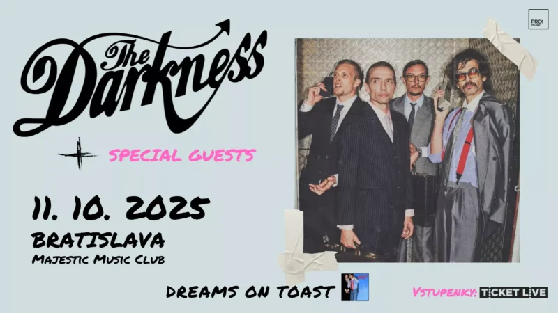 The Darkness oznámili európsku časť turné Dreams On Toast 2025, v rámci ktorého rockové legendy odohrajú na jeseň 17 koncertov po celej Európe. Britská glam rocková senzácia The Darkness prichádza do Bratislavy, aby svojim fanúšikom priniesla nielen obľúbené hity, ale aj čerstvú dávku piesní z nového albumu „Dreams on Toast“, ktorého vydanie je naplánované na marec 2025. Ich nezameniteľný štýl, humor a ikonický zvuk sľubujú vystúpenie, ktoré v publiku rozhýbe všetky generácie. Kapela vystúpi 11. októbra 2025 v bratislavskom Majestic Music Clube a pripraví pamätihodný večer.