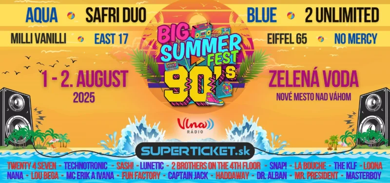 Najväčší letný festival hviezd 90-tych rokov v strednej Európe! Taký bude BIG SUMMER FEST 2025, ktorý vypukne 1. a 2. augusta 2025 na Zelenej vode pri Novom Meste nad Váhom. Na prvom ročníku obrieho festivalu vystúpi celkovo 30 interpretov. Príďte si zabaviť na hity megahviezd AQUA, BLUE, SAFRI DUO, 2 UNLIMITIED, EAST 17, MILI VANILLI, FUN FACTORY, LOU BEGA, TECHNOTRONIC, NO MERCY, DR. ALBAN, HADDAWAY, LOONA, EIFFEL 65, CAPTAIN JACK, THE KLF či MR. PRESIDENT! V predaji je prvých 999 permanentiek za akciovú cenu 99 eur!