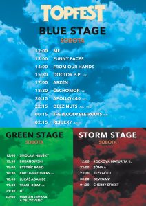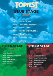 Festival ponúka dva dni plné hudby a tri pódiá. Blue stage čiže hlavné pódium bude patriť headlinerom – gitaristovi Slashovi so spevákom Mylesom Kennedym a sprievodnou kapelou The Conspirators, skupine Apollo 440, kapelám Deez Nuts, Horkýže Slíže, Čechomor. Na Green stage vystúpia Desmod, Zemětřesení, Šarišanci, Lukáš Adamec a ďalší. Storm stage bude určená pre fanúšikov hlavne domácej scény a zahrajú na ňom aj mladé nádejné slovenské kapely. Na Storm stage sa bude po oba dni festivalu konať semifinále hudobnej súťaže Rocková maturita. O dobrú náladu na TOPFESTe sa postará aj česká skupina Walda Gang, ktorá sa živí recesiou a country-rockovými úpravami najväčších hitov nesmrteľného Waldemara Matušku. V ich podaní zaznejú hitovky Eldorádo, Jó třešně zrály, Písnička pro Zuzanu, Orchestrion, alebo Slavíci z Madridu.
