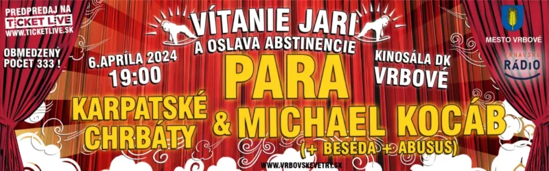 Vrbovská Kinosála sa chystá na nezabudnuteľný večer plný hudby, zábavy a osláv. Srdečne vás pozývame na podujatie Vítanie jari a oslavu abstinencie, ktoré sa uskutoční v sobotu, 6. apríla 2024, so začiatkom o 19:00 hod. v malebnom meste Vrbové.