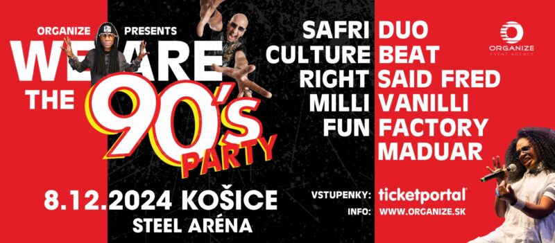 Dňa 8. decembra 2024 sa v Steel Aréne v Košiciach uskutoční jedinečná show s názvom We are the 90’s Party, ktorá prinesie na pódium hviezdy populárne v 90-tych rokoch. Tento výnimočný večer predstaví nostalgické hity a nezabudnuteľné vystúpenia umelcov, ktorí formovali hudobnú scénu tejto éry.